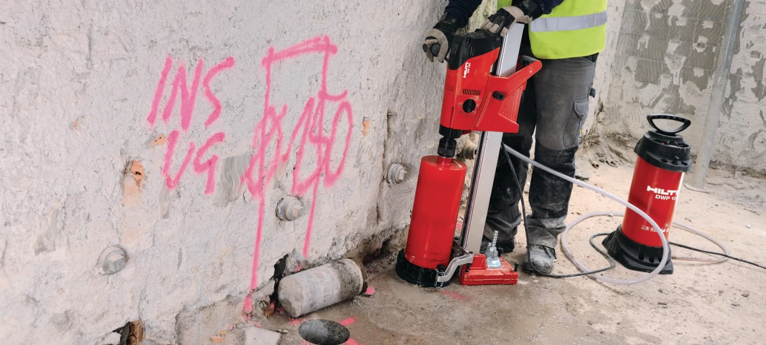 Carottage sur colonne à eau dans le béton pour passage de tuyaux dans des installations de plomberie, chauffage et climatisation