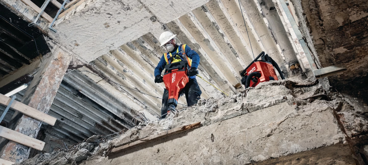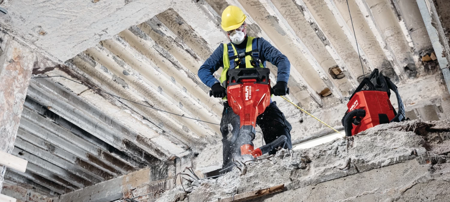 Démolition pratiquement sans poussière – jusqu’à 95 % de réduction de la poussière fine de silice en cas d’utilisation avec un système de récupération de la poussière TE DRS-B et un aspirateur Hilti compatible
